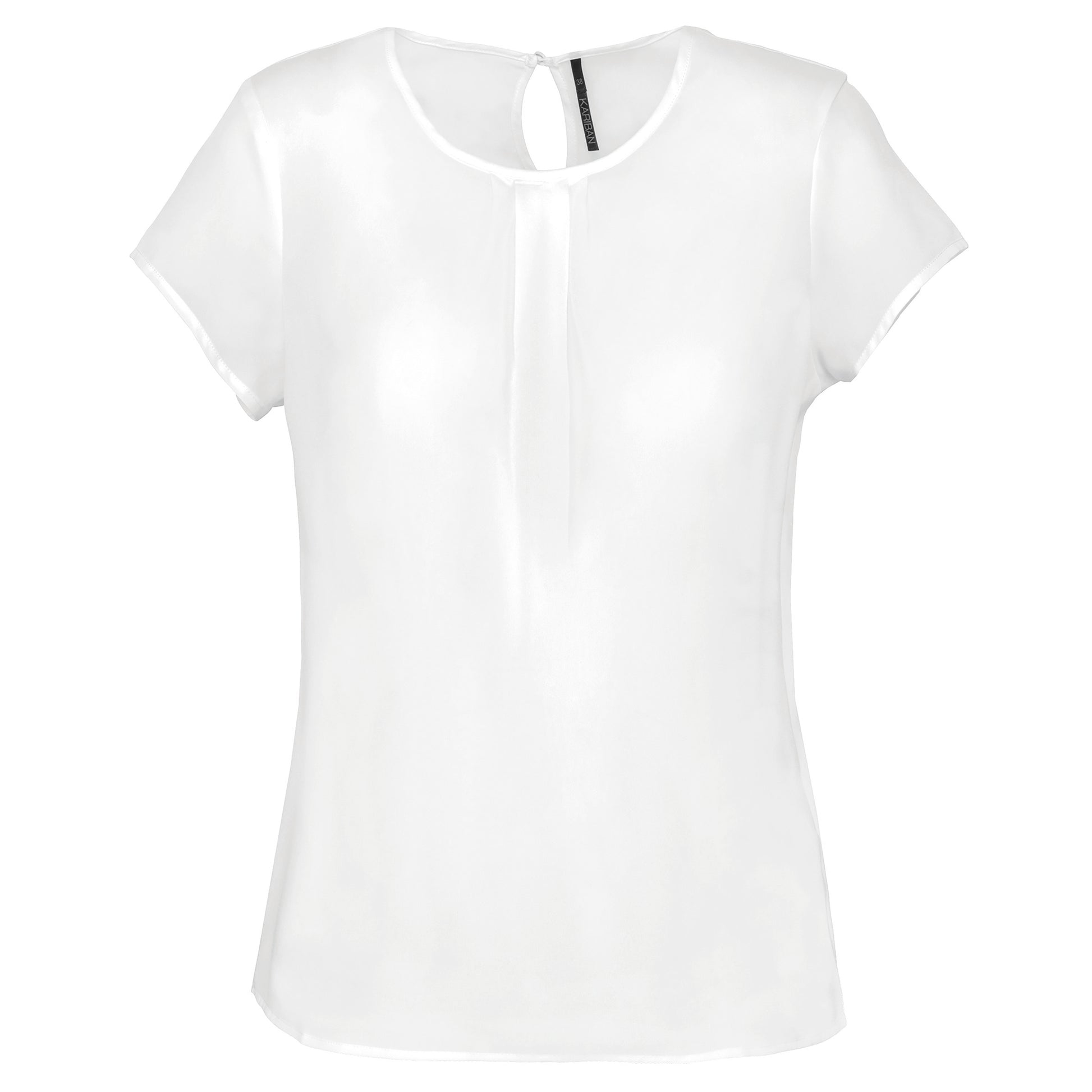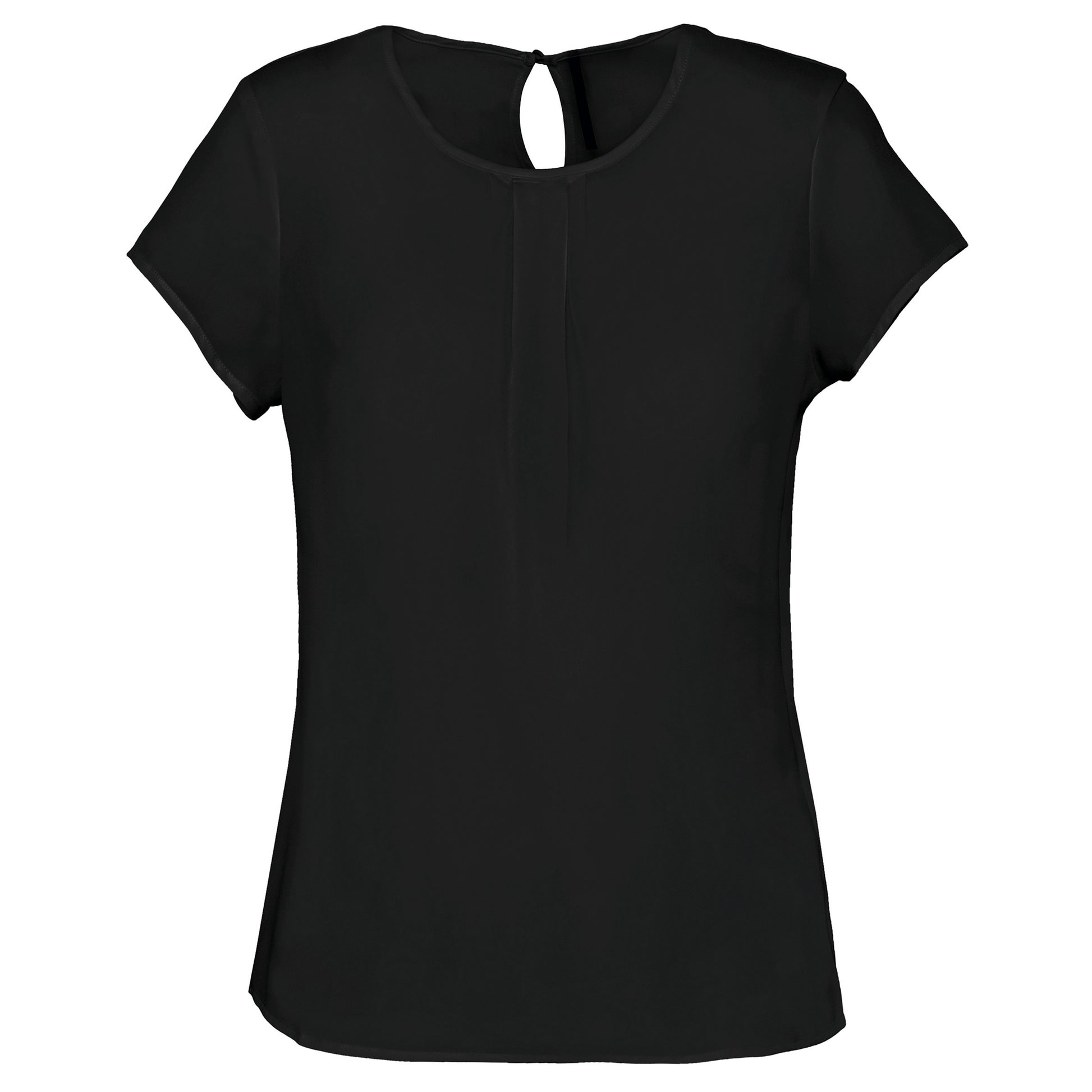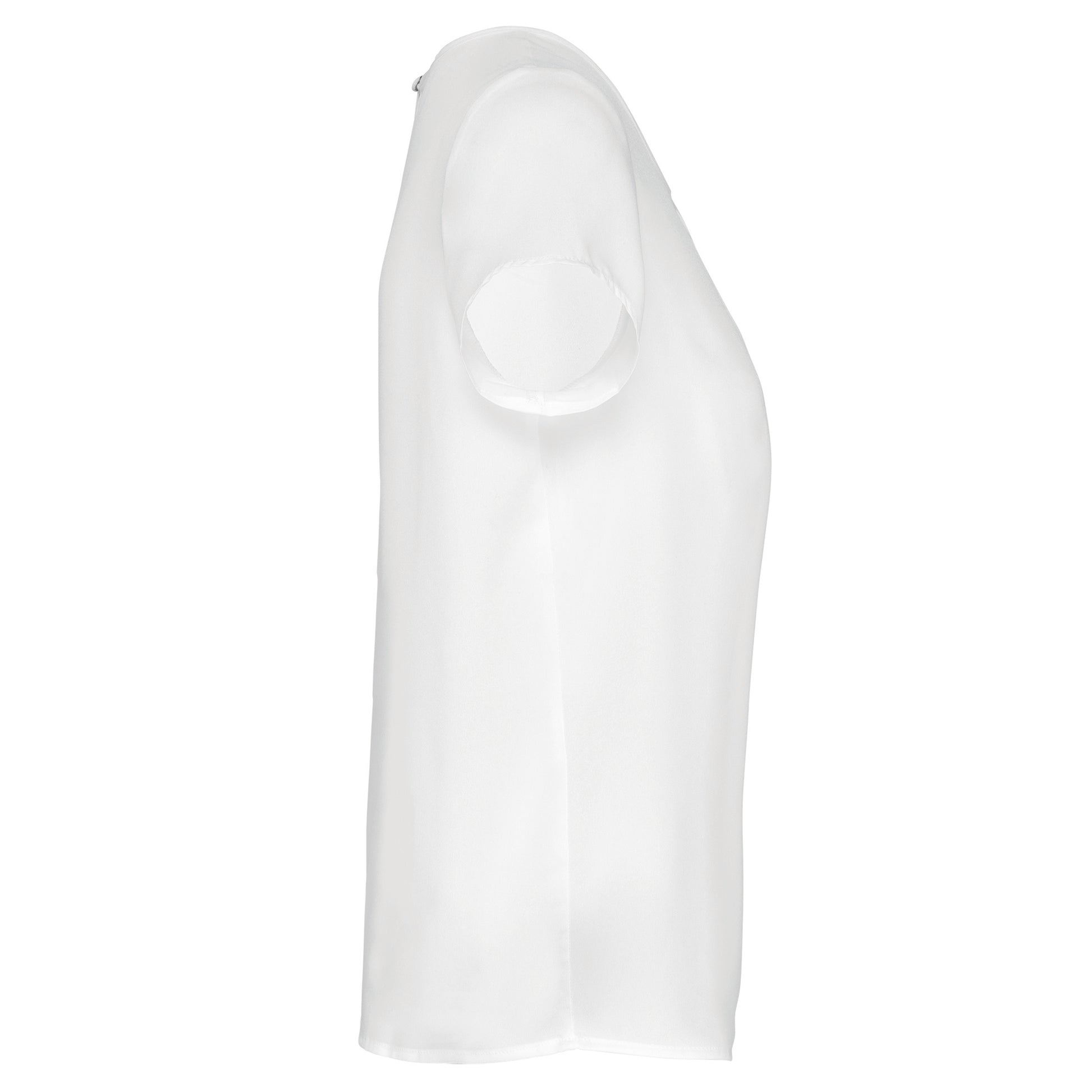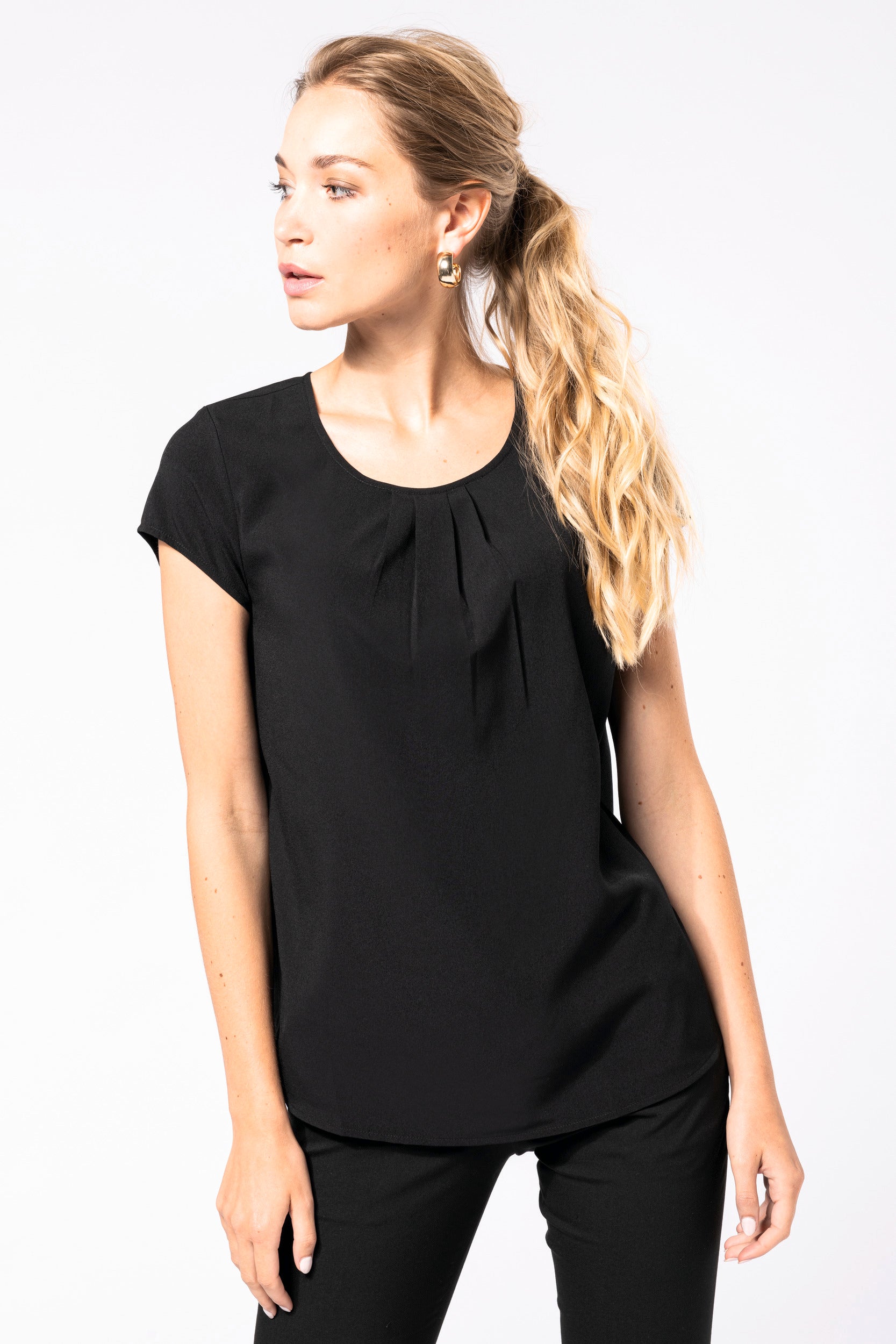 100% polyester. Soepele en lichte crÍpe. Ronde hals. Fronsjes aan de halsopening aan de voorkant. Sluiting aan de achterzijde met een afgedekte knop. K5002