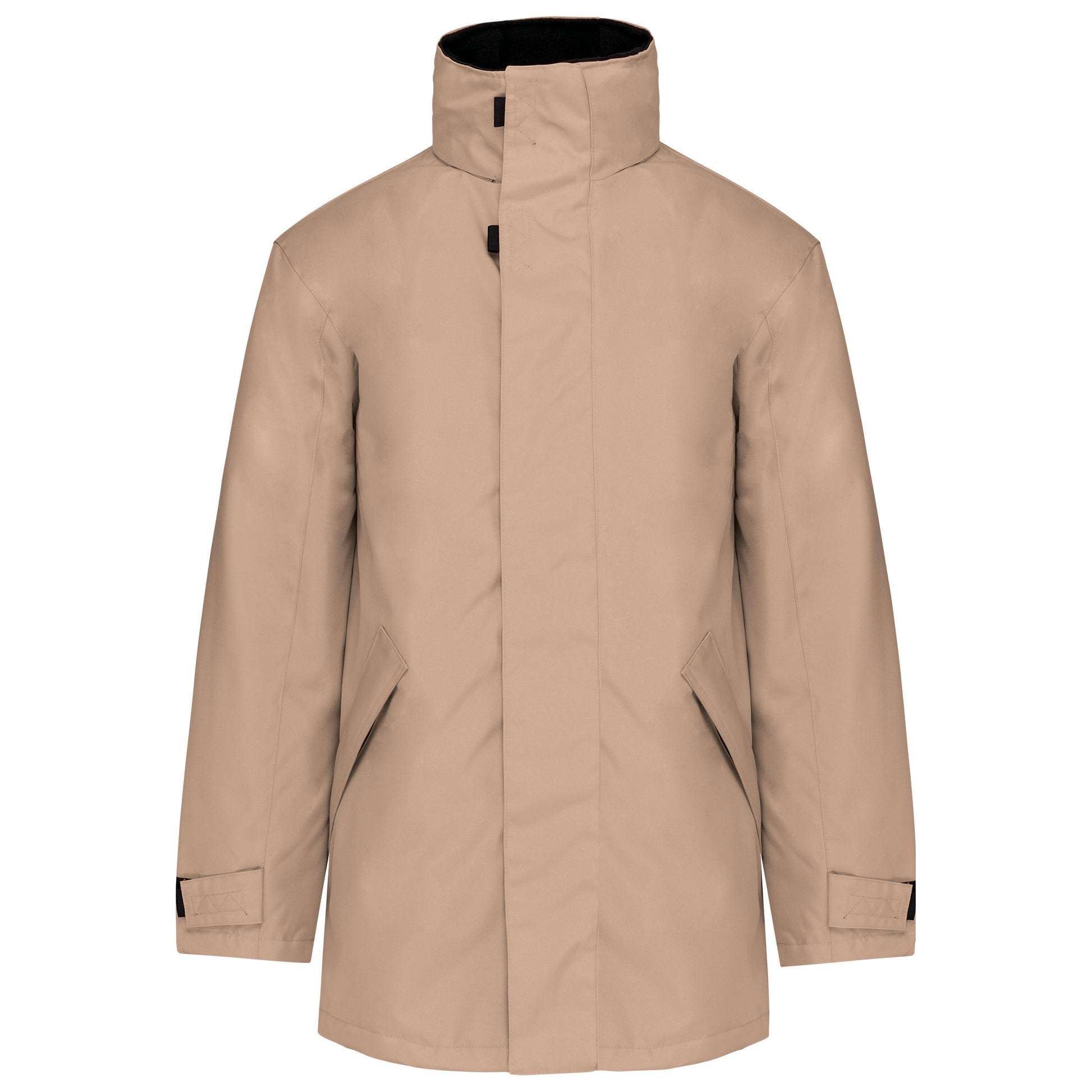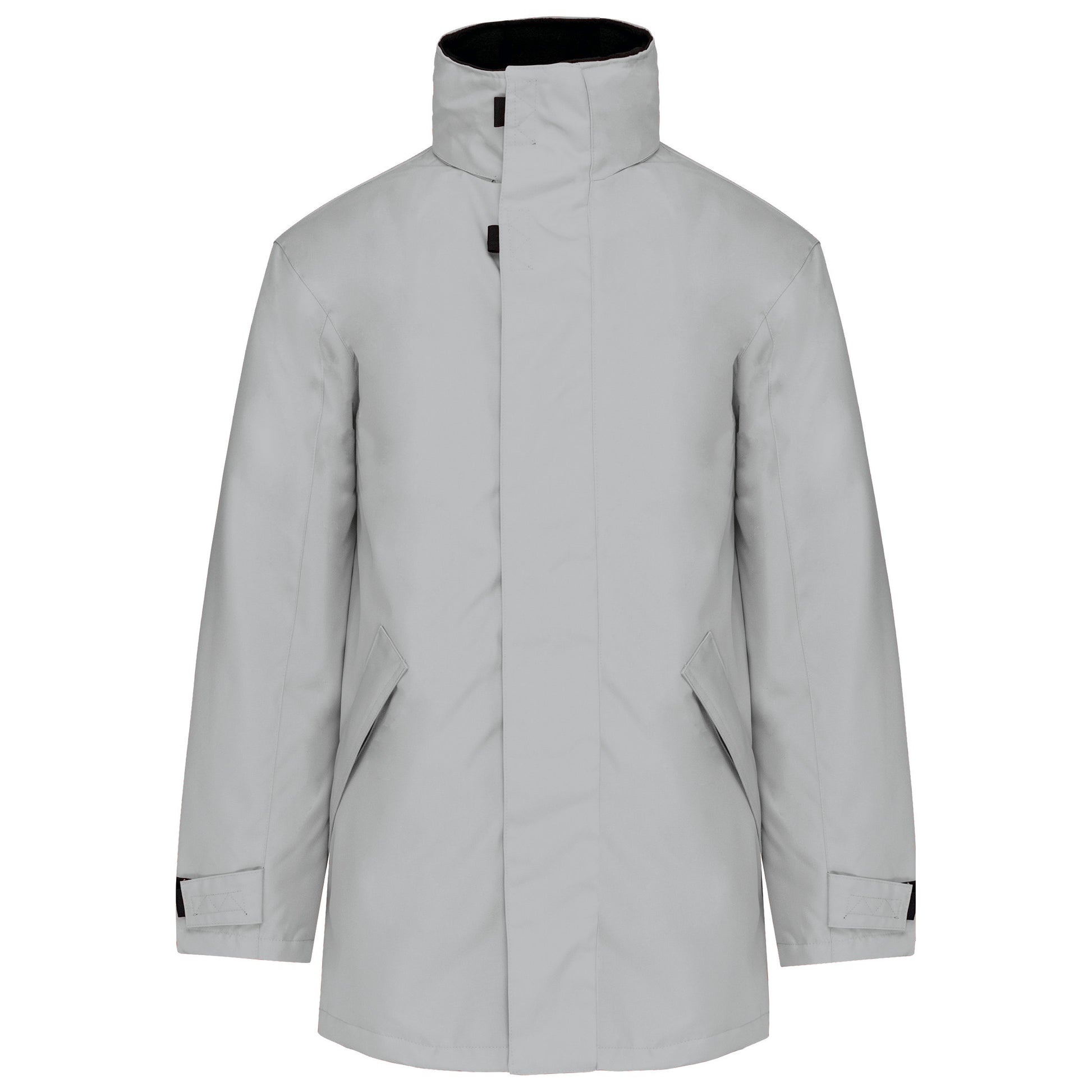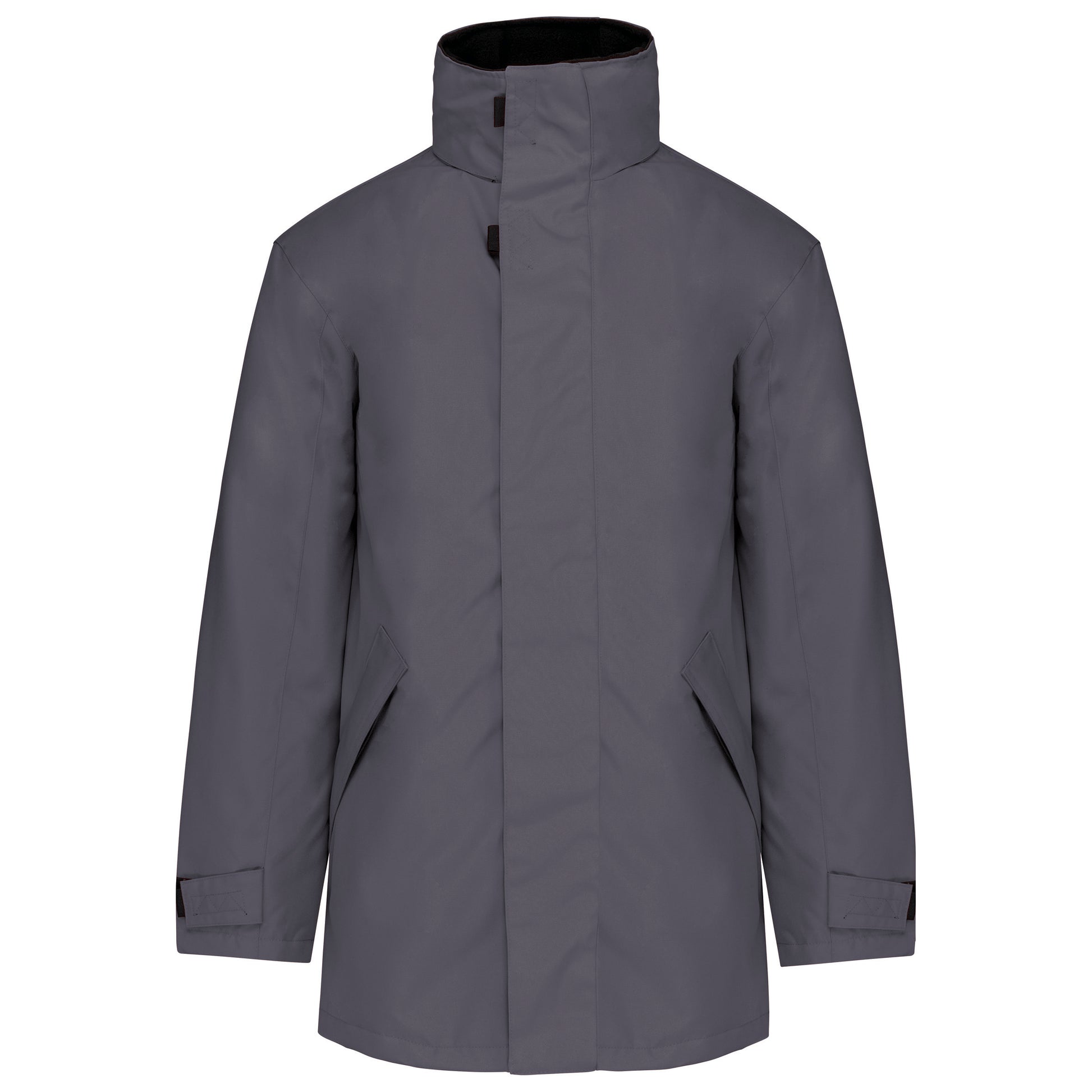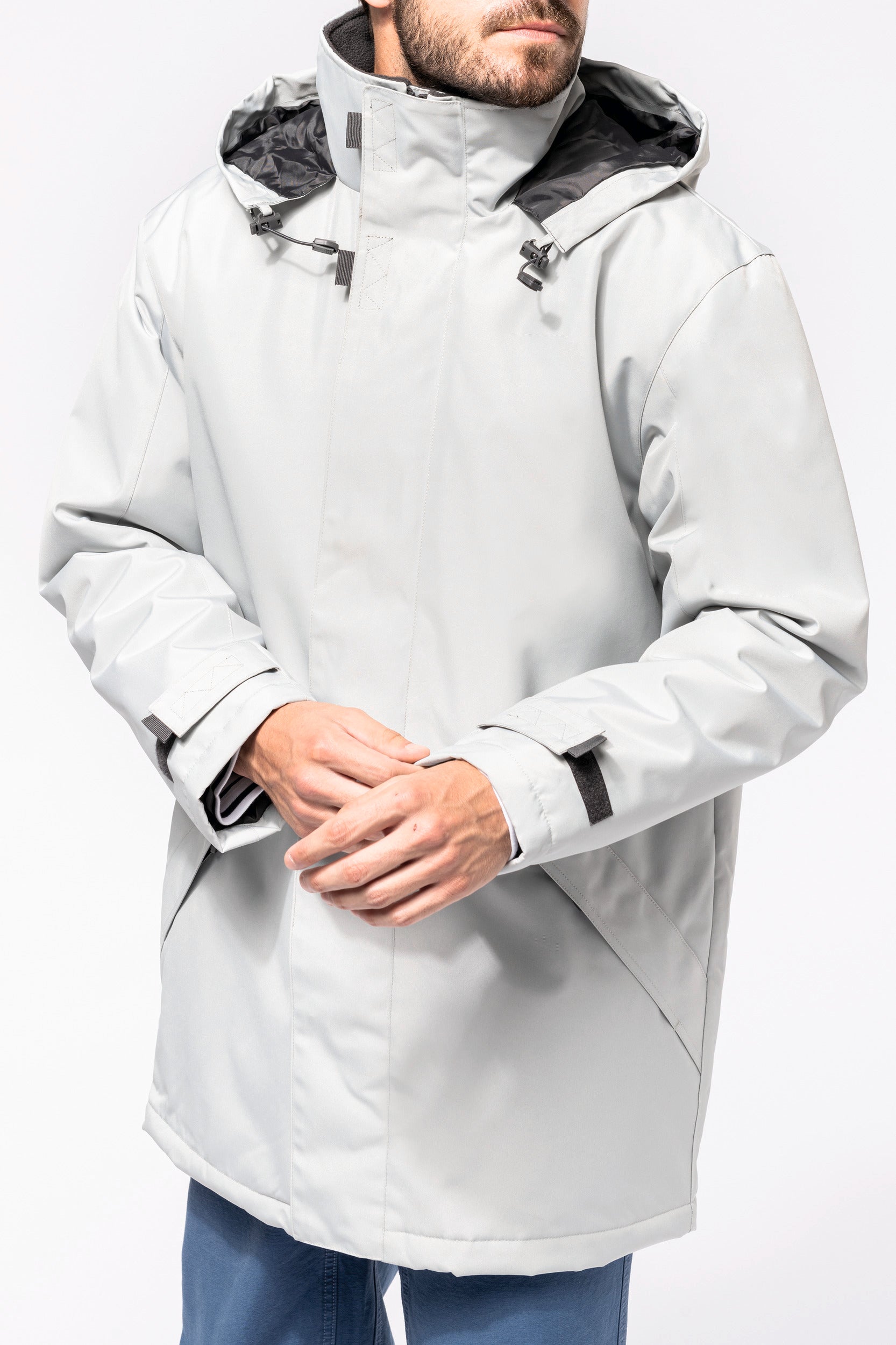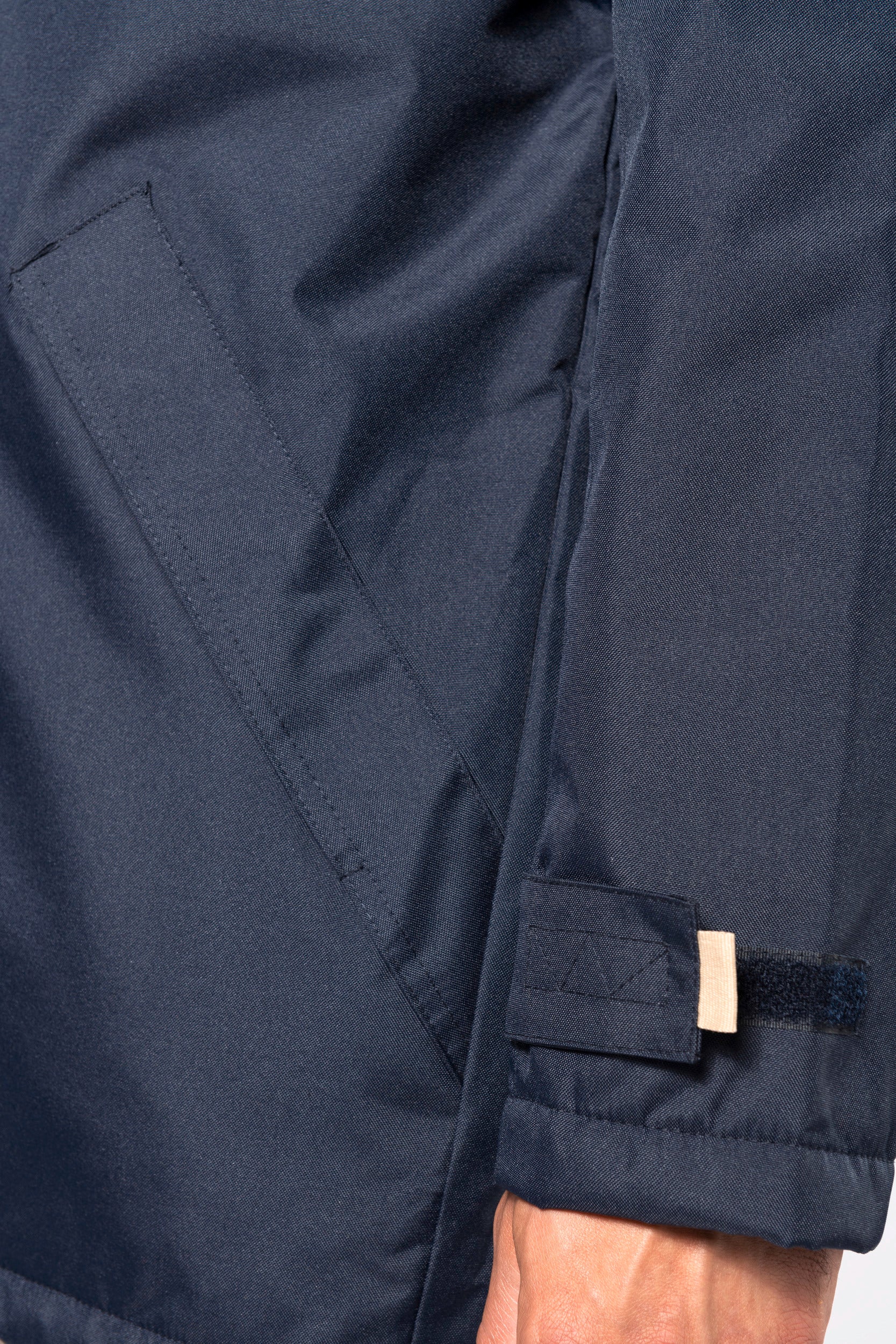 Buitenkant: 100% oxford polyester. Binnenkant: gewatteerd polyester. 2 voorzakken met rits. 2 binnenzakken waarvan 1 voor de GSM. Capuchon verborgen in de kraag. Kraag met fleecevoering. Drukkersrits. Ritssluiting verborgen onder een lijst met drukknopen en klittenband. Verstelbare mouwuiteinden met klittenband. K677