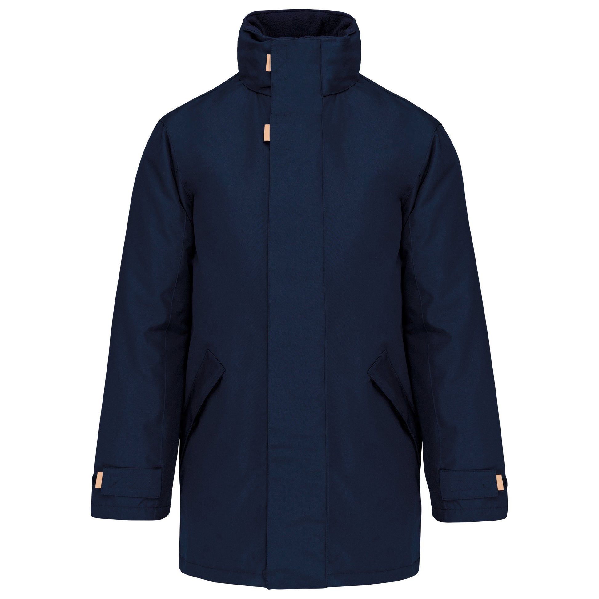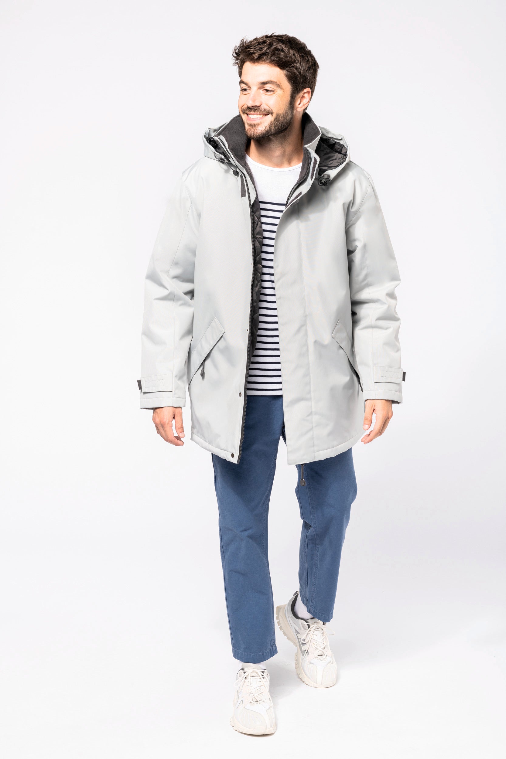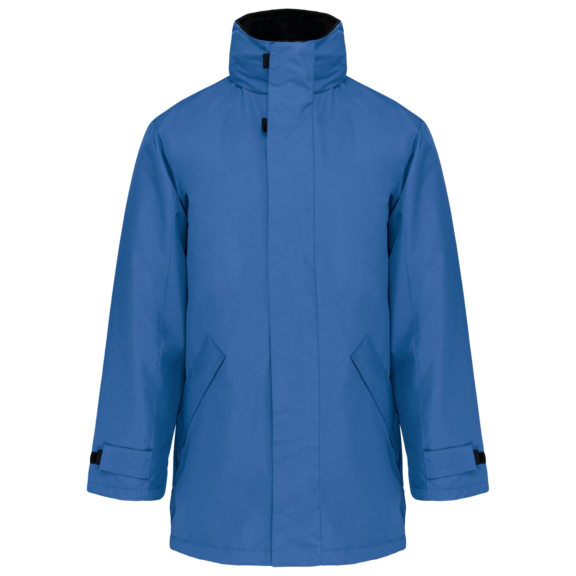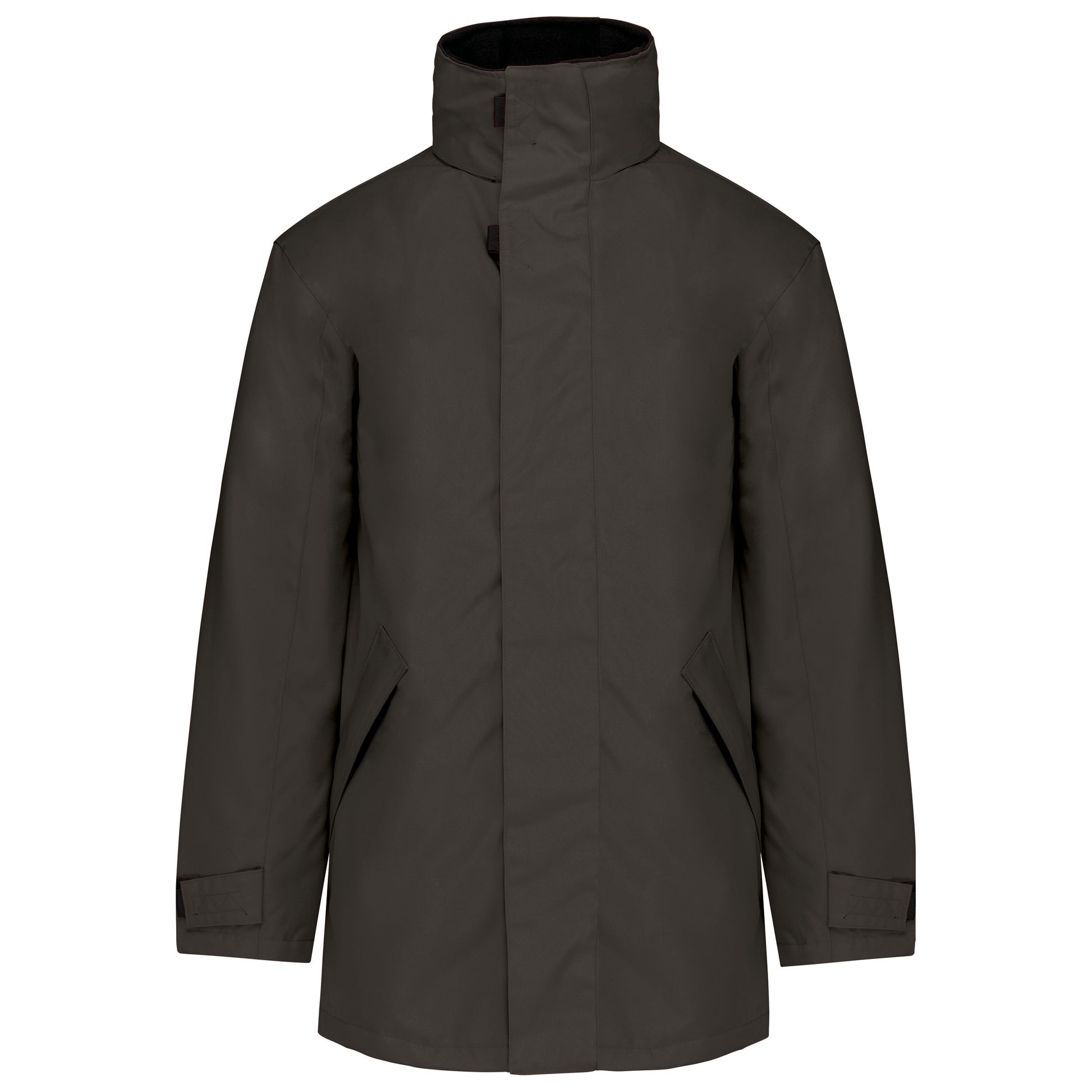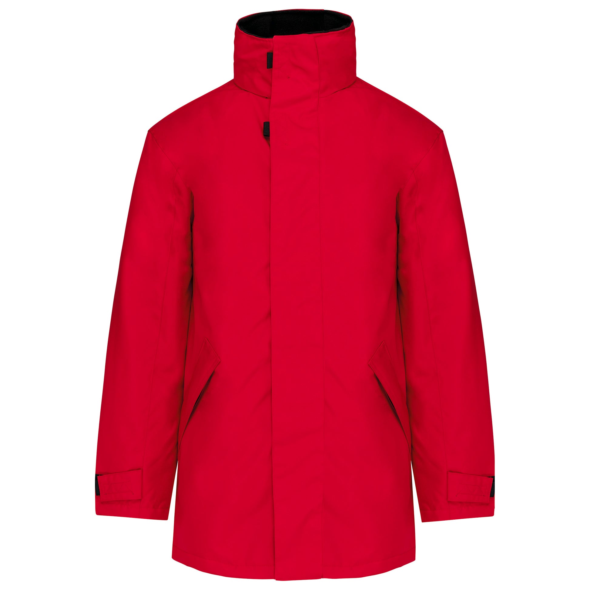 Buitenkant: 100% oxford polyester. Binnenkant: gewatteerd polyester. 2 voorzakken met rits. 2 binnenzakken waarvan 1 voor de GSM. Capuchon verborgen in de kraag. Kraag met fleecevoering. Drukkersrits. Ritssluiting verborgen onder een lijst met drukknopen en klittenband. Verstelbare mouwuiteinden met klittenband. K677