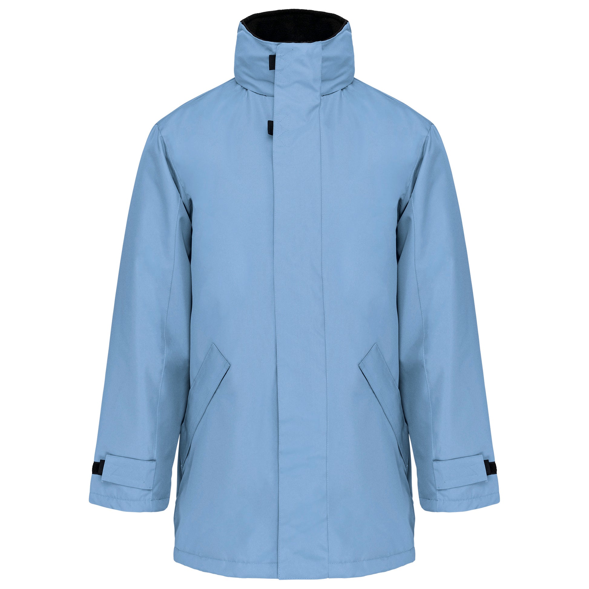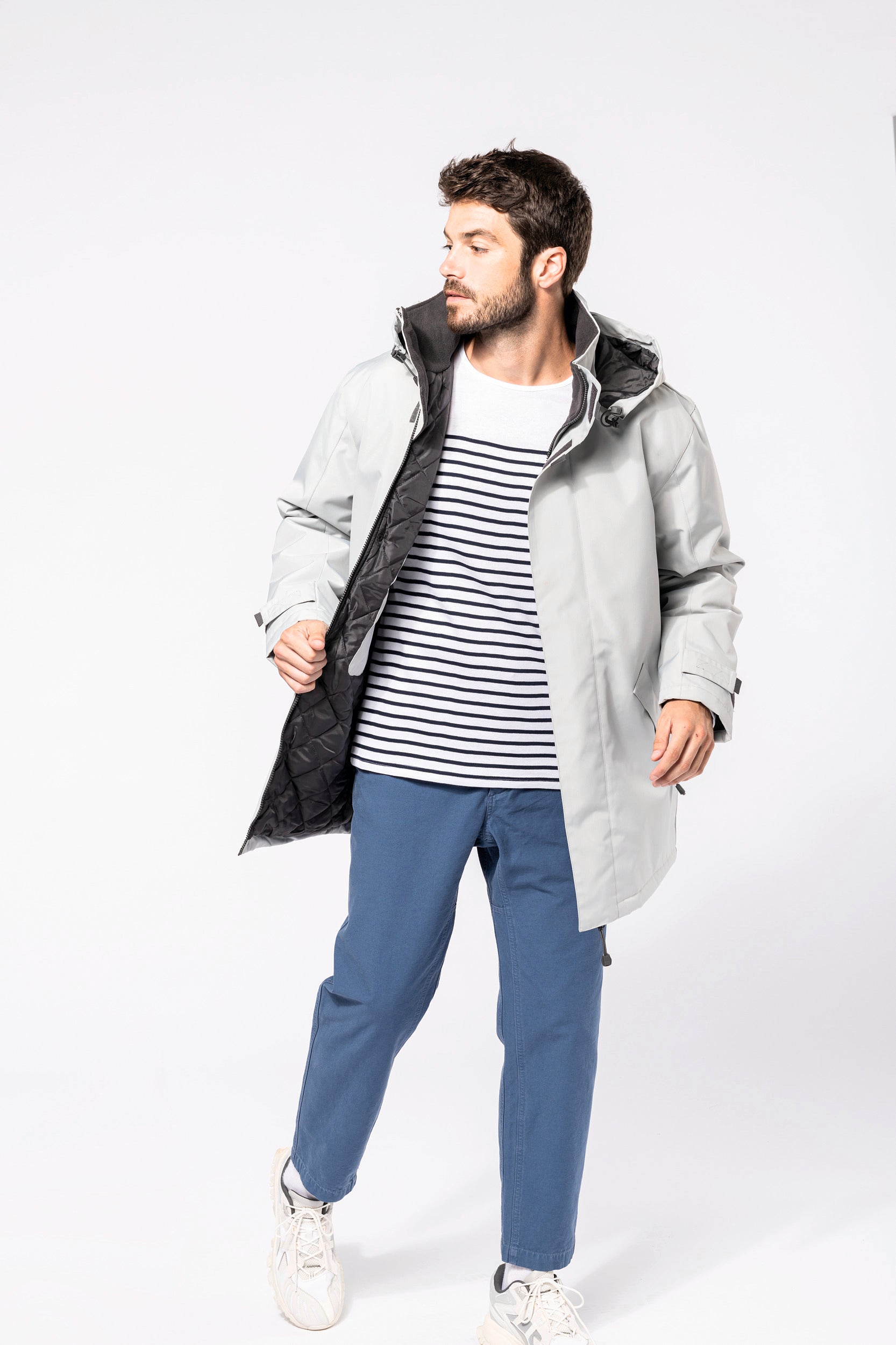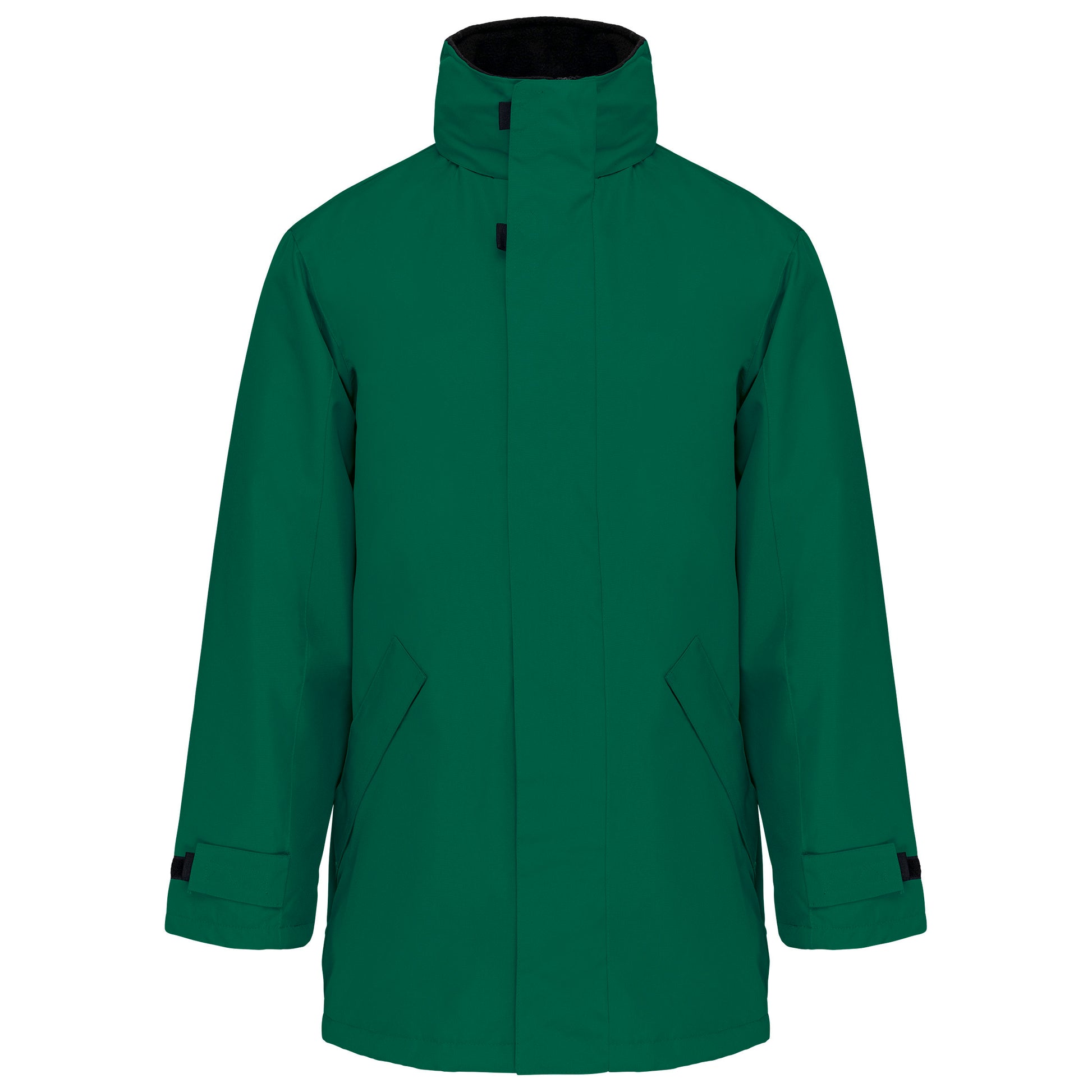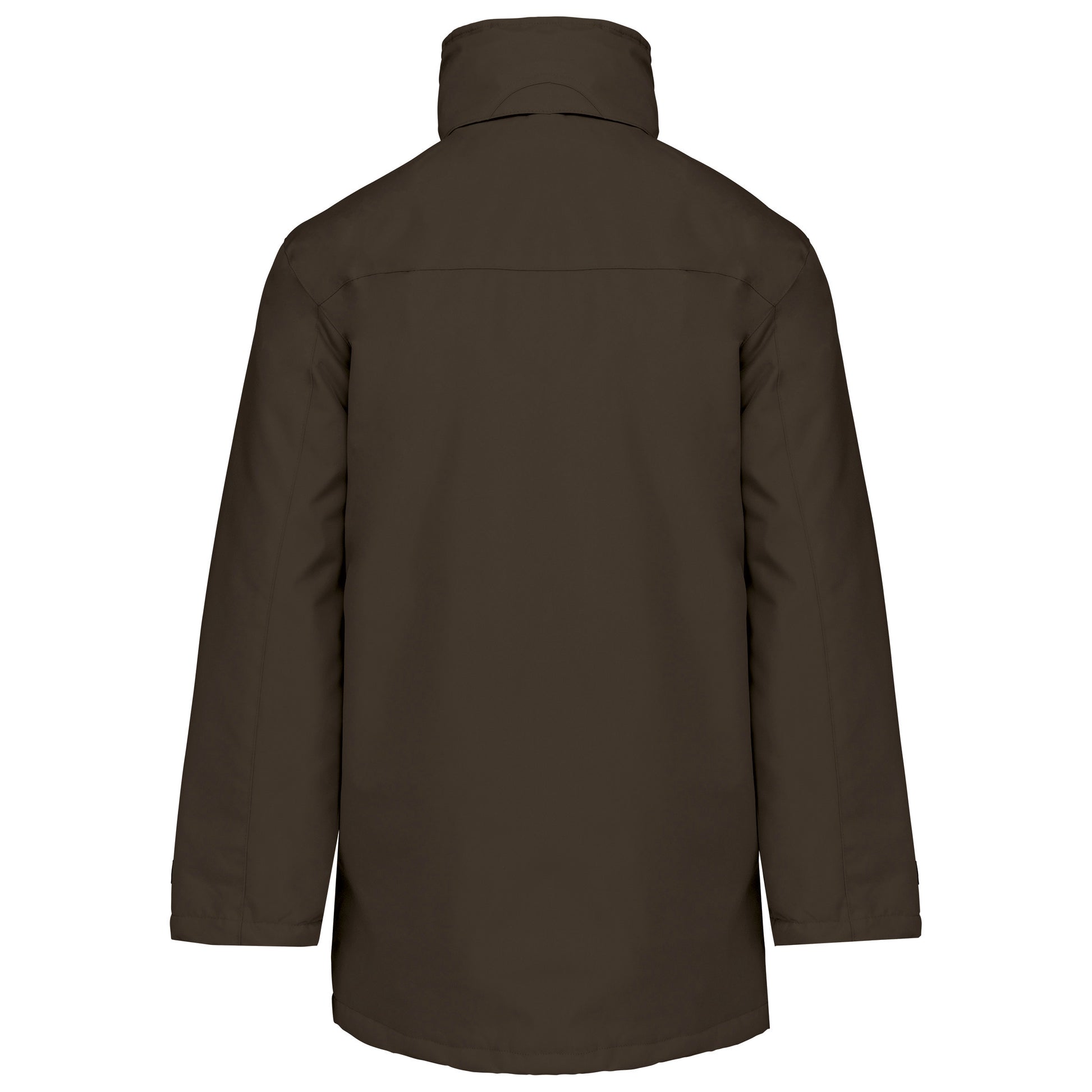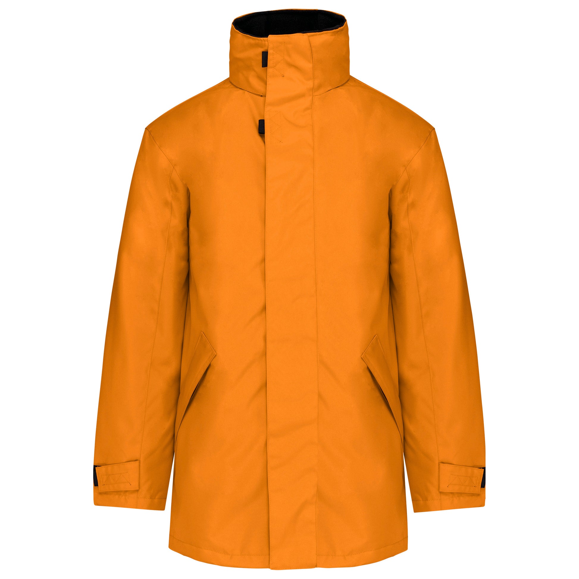 Buitenkant: 100% oxford polyester. Binnenkant: gewatteerd polyester. 2 voorzakken met rits. 2 binnenzakken waarvan 1 voor de GSM. Capuchon verborgen in de kraag. Kraag met fleecevoering. Drukkersrits. Ritssluiting verborgen onder een lijst met drukknopen en klittenband. Verstelbare mouwuiteinden met klittenband. K677