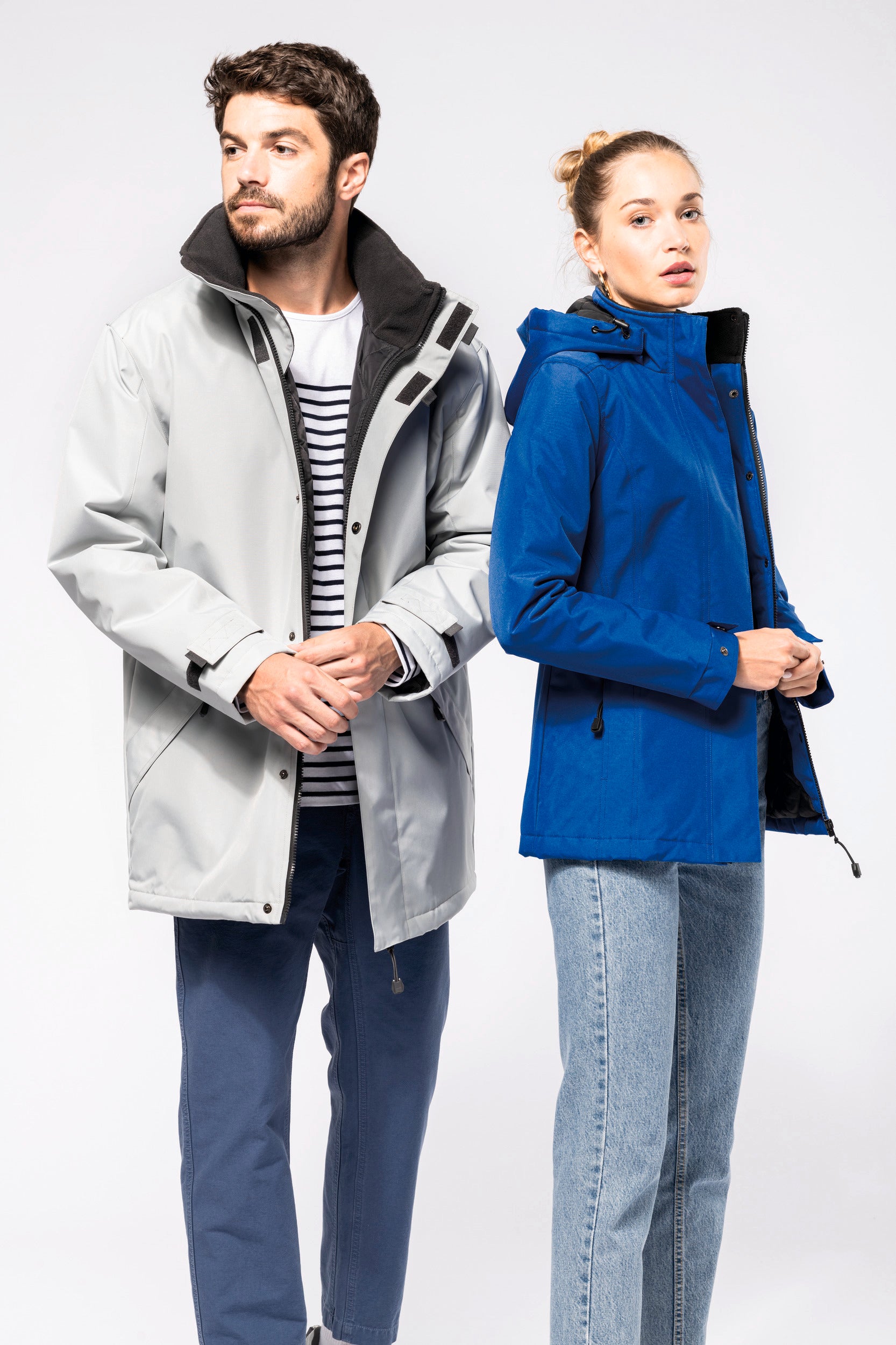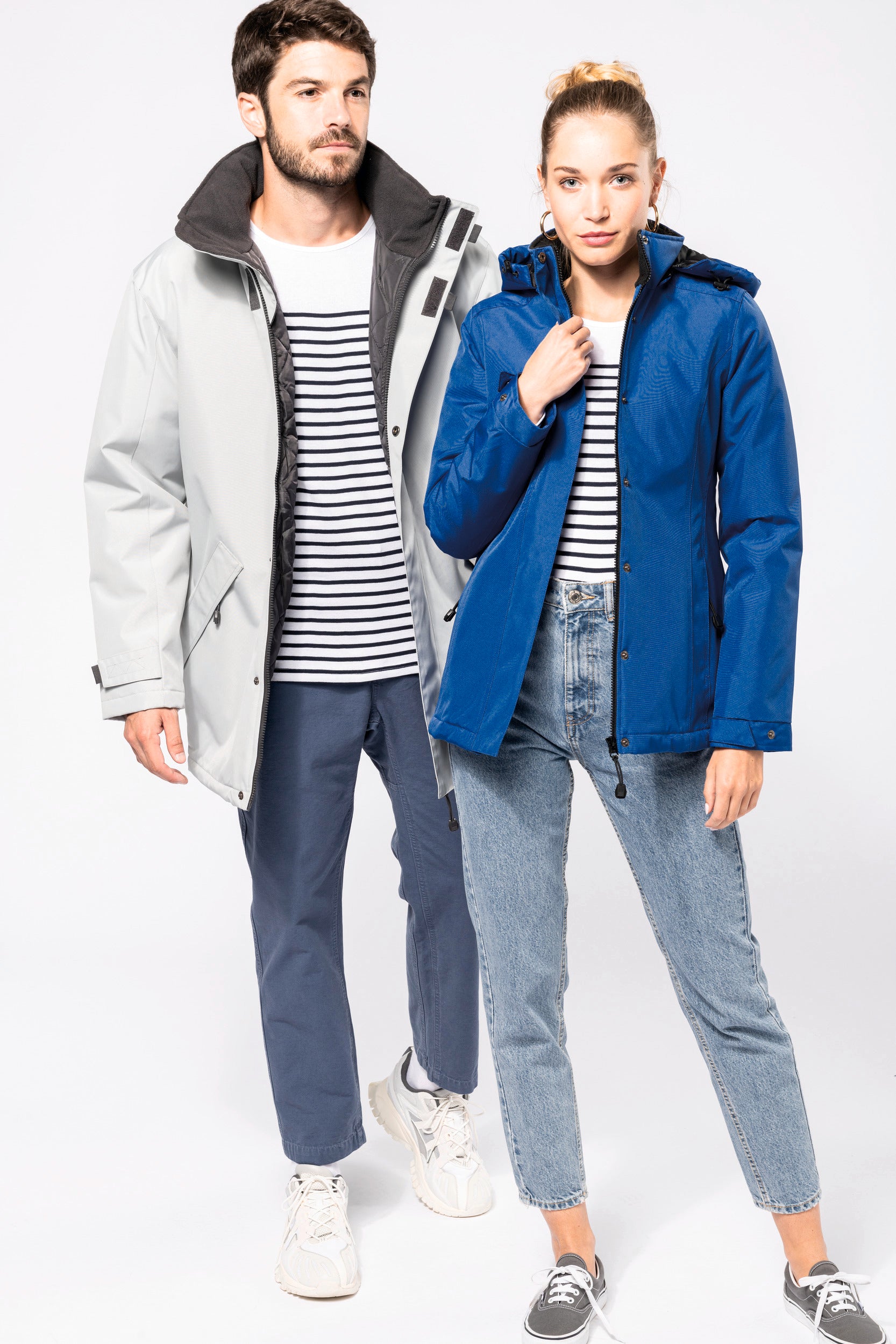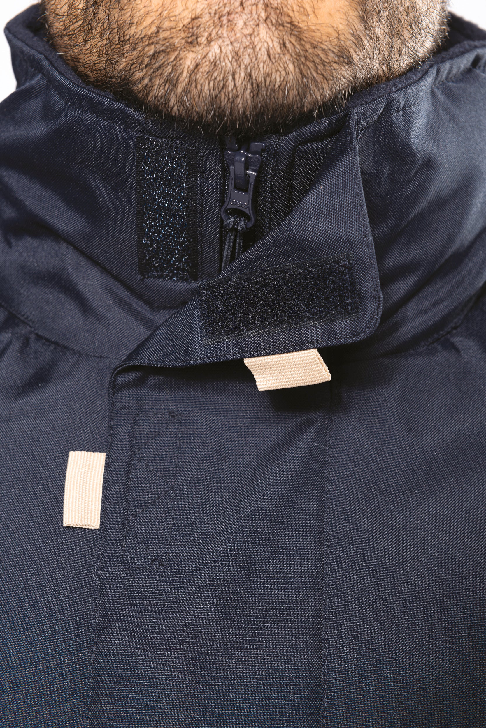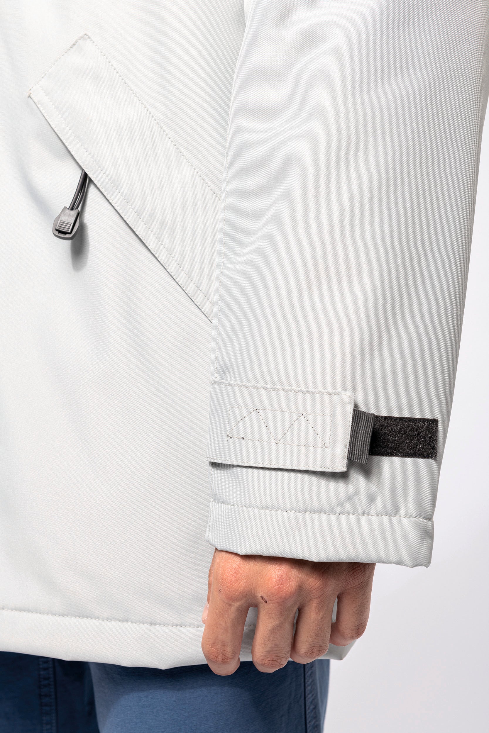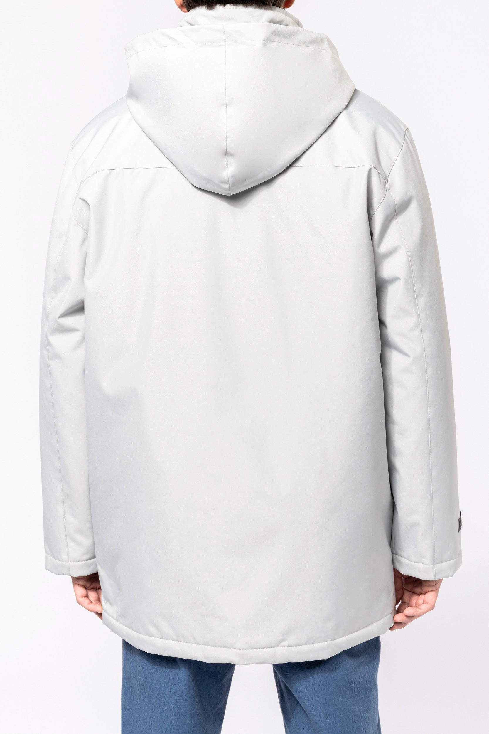 Buitenkant: 100% oxford polyester. Binnenkant: gewatteerd polyester. 2 voorzakken met rits. 2 binnenzakken waarvan 1 voor de GSM. Capuchon verborgen in de kraag. Kraag met fleecevoering. Drukkersrits. Ritssluiting verborgen onder een lijst met drukknopen en klittenband. Verstelbare mouwuiteinden met klittenband. K677