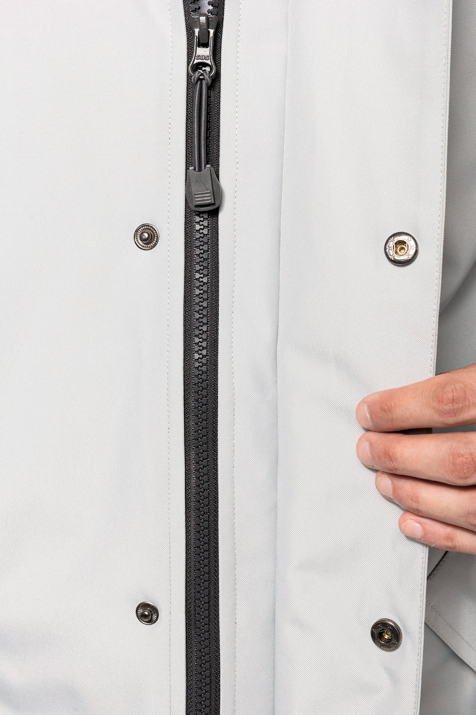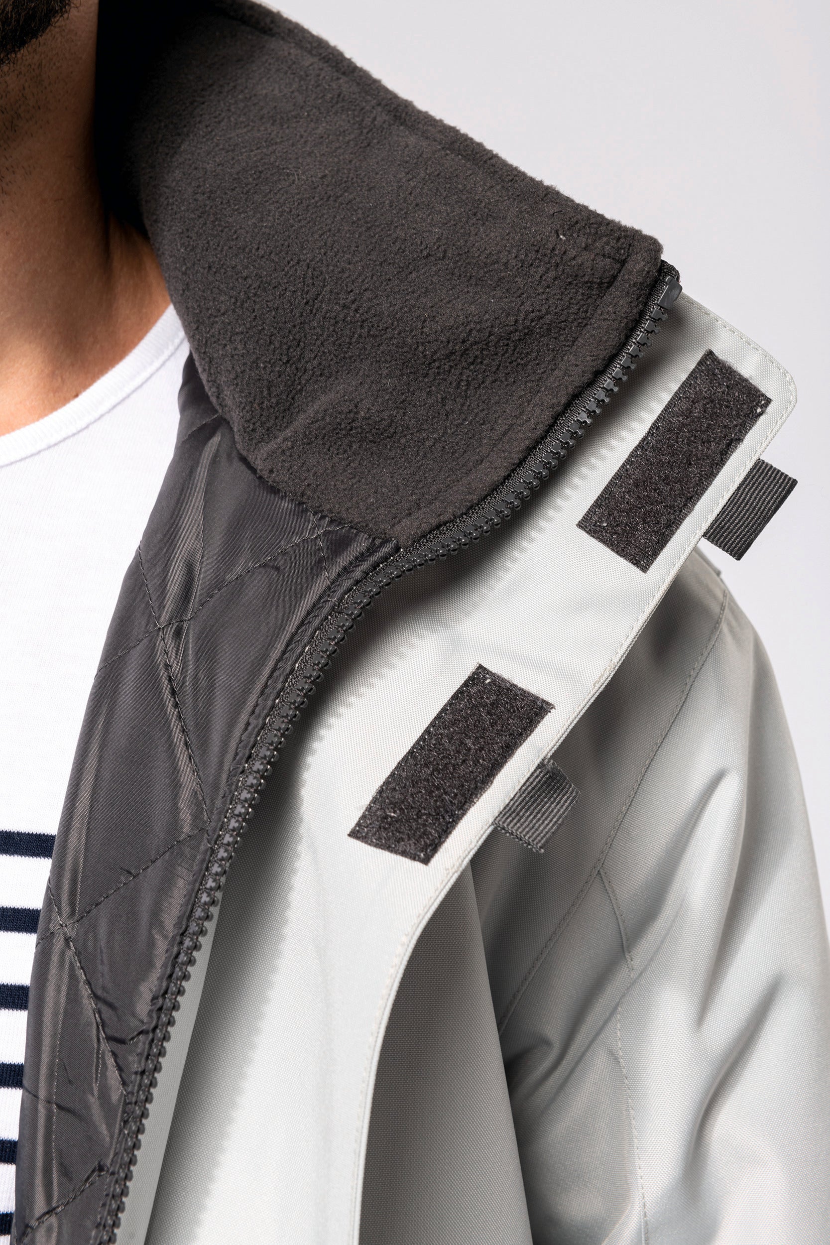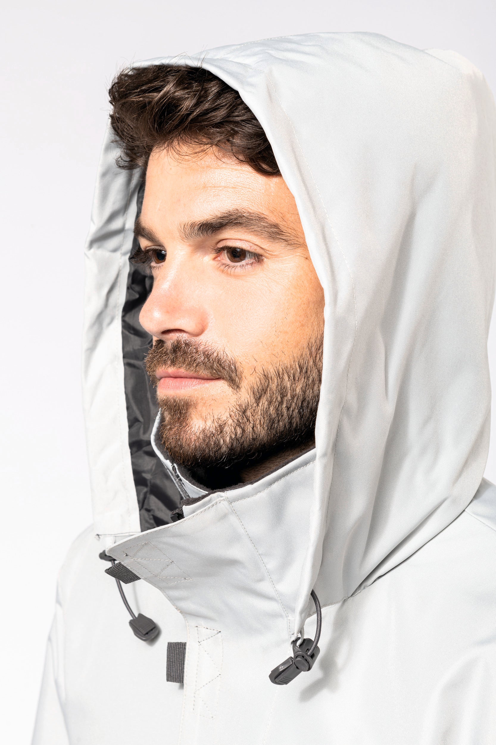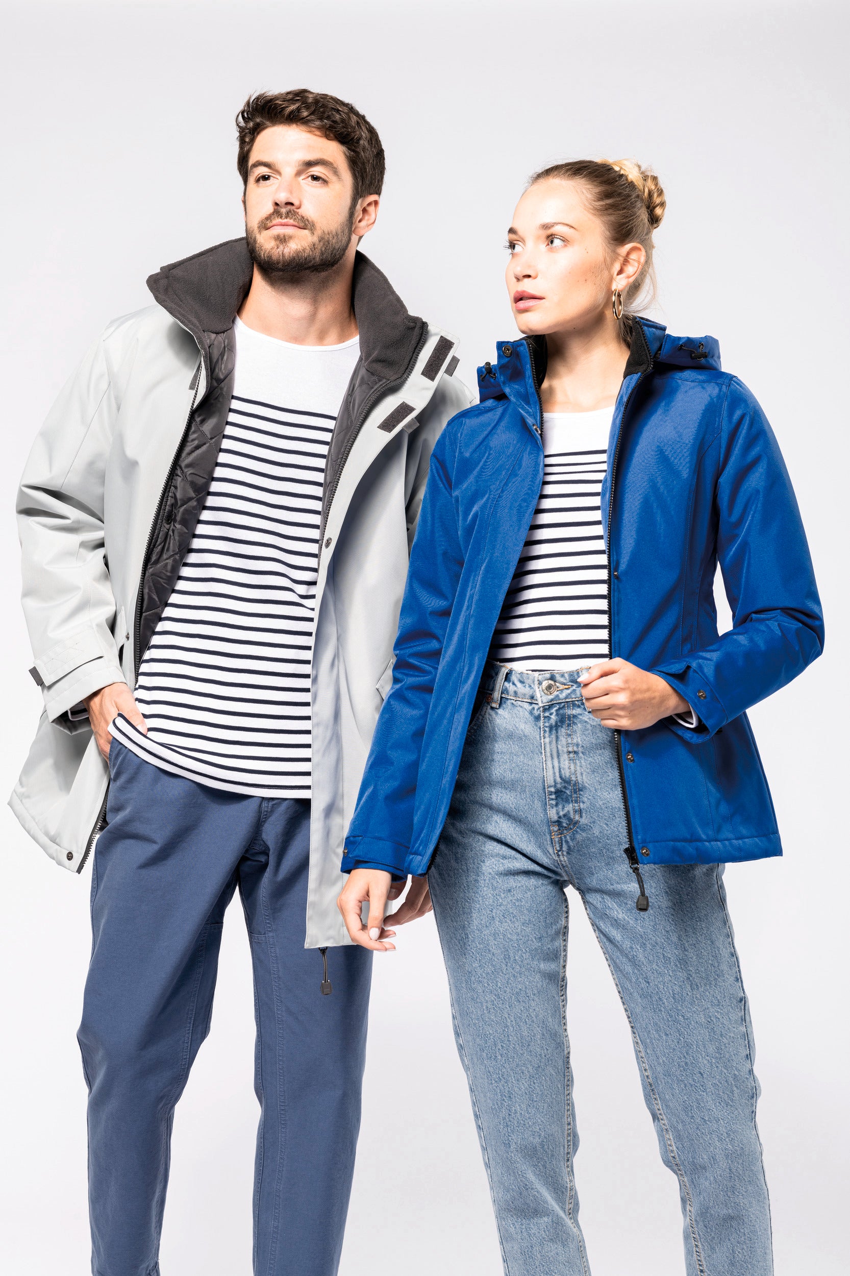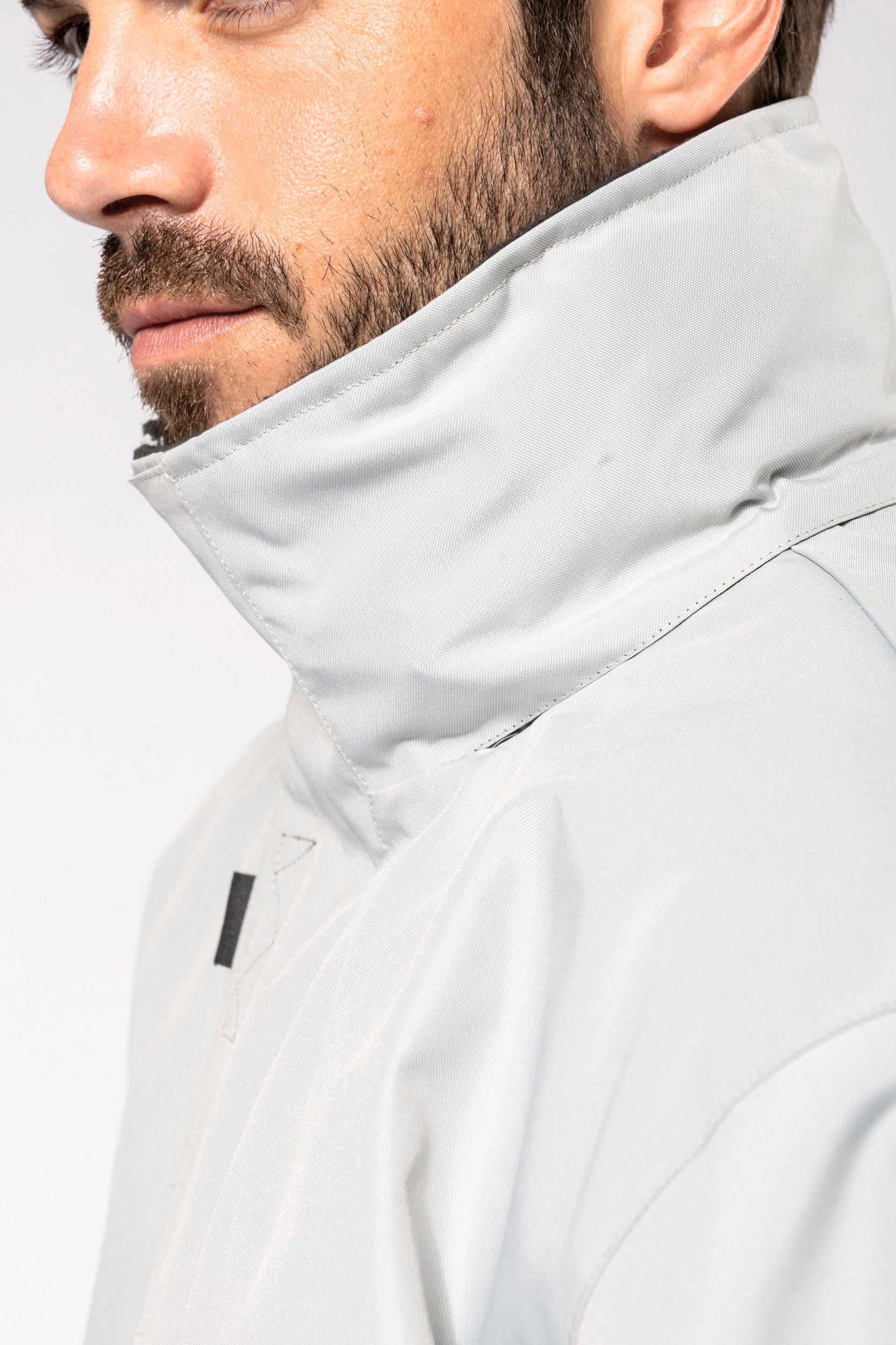 Buitenkant: 100% oxford polyester. Binnenkant: gewatteerd polyester. 2 voorzakken met rits. 2 binnenzakken waarvan 1 voor de GSM. Capuchon verborgen in de kraag. Kraag met fleecevoering. Drukkersrits. Ritssluiting verborgen onder een lijst met drukknopen en klittenband. Verstelbare mouwuiteinden met klittenband. K677