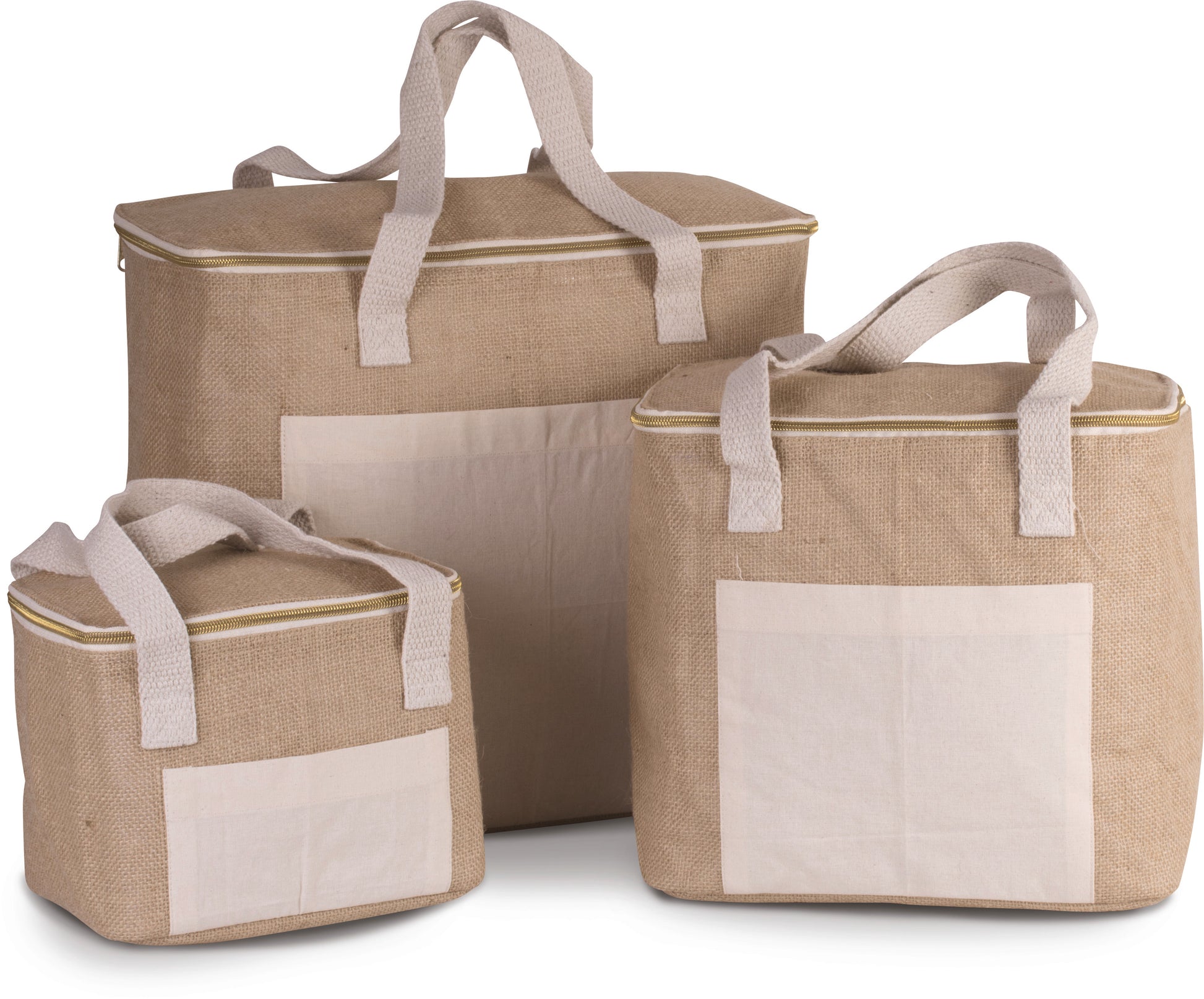 Koeltas met buitenzijde van jutecanvas en katoenen zak voor eenvoudige personalisatie, koelvak binnenin met isolerende wand van aluminium en koelschuim met hoge densiteit. Katoenen hengsels. Groot model.KI0354