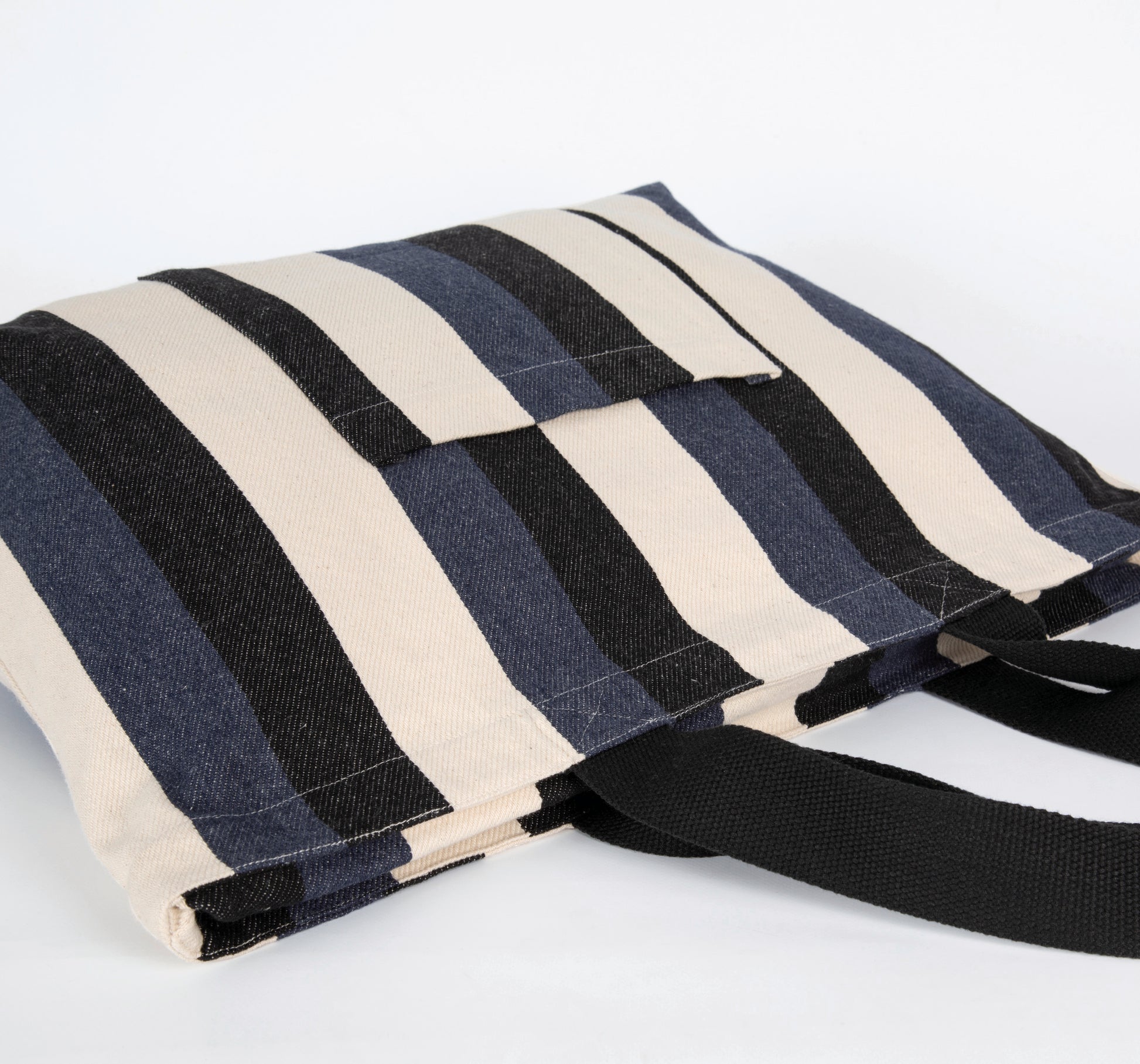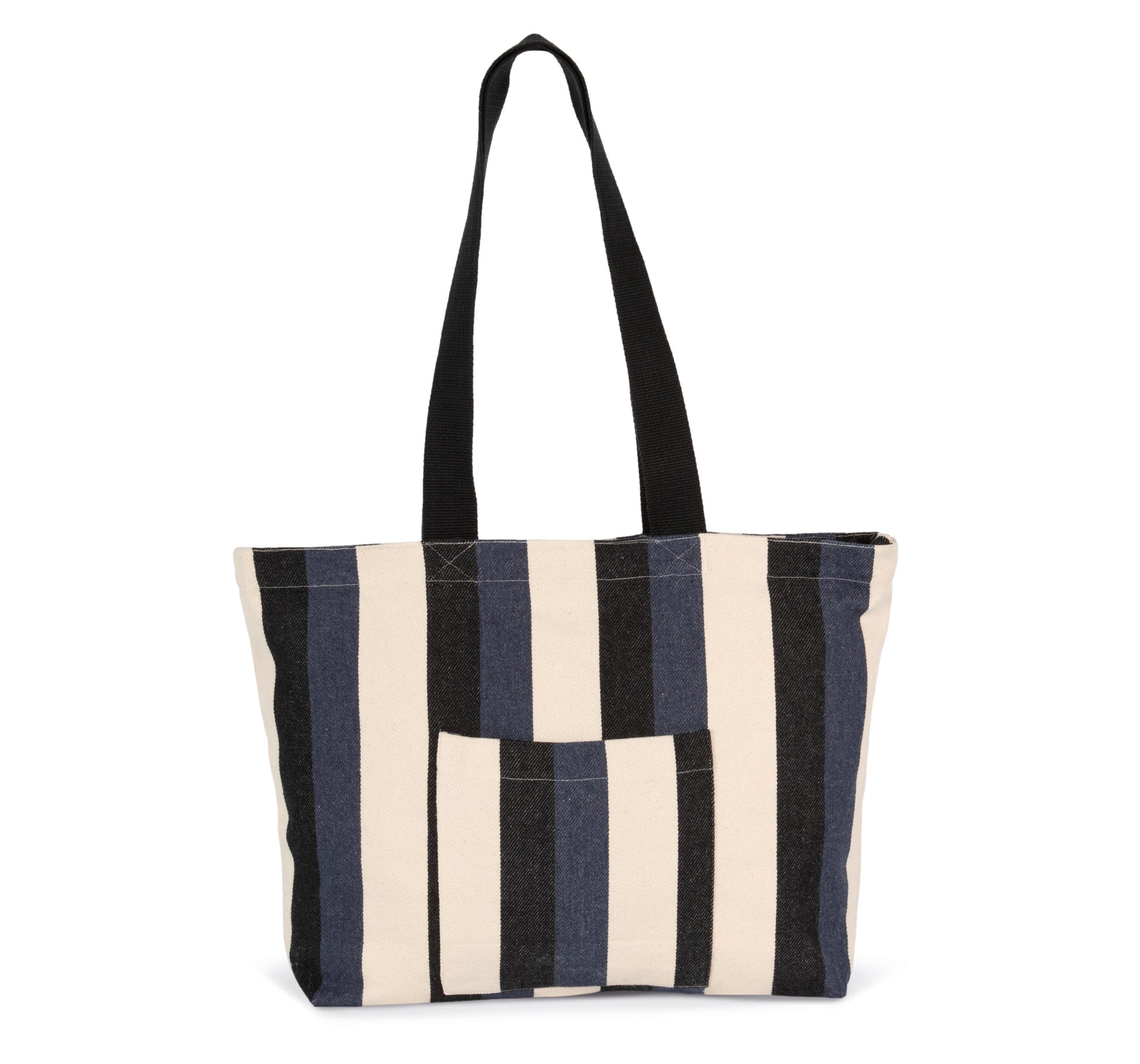 78% katoen / 20% polyester / 2% andere vezels. Shopper van 78% gerecycled katoen en 20% gerecycled polyester. De binnenkant van de tas werd gevoerd met een stof in een contrasterende kleur. Het hoofdvak kreeg een ritssluiting. De tas kreeg een binnenzak met ritssluiting en hengels van 4 cm breed voor meer comfort. De gestreepte twillstof geeft ieder stuk een unieke look. KI5210