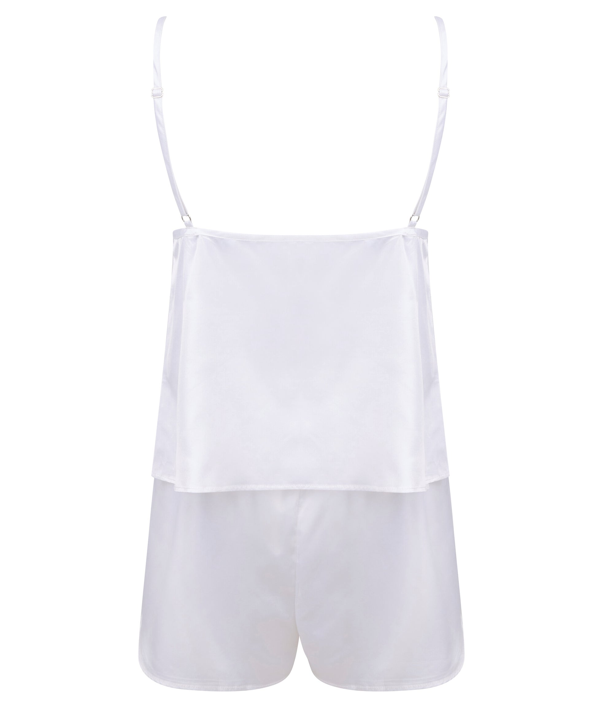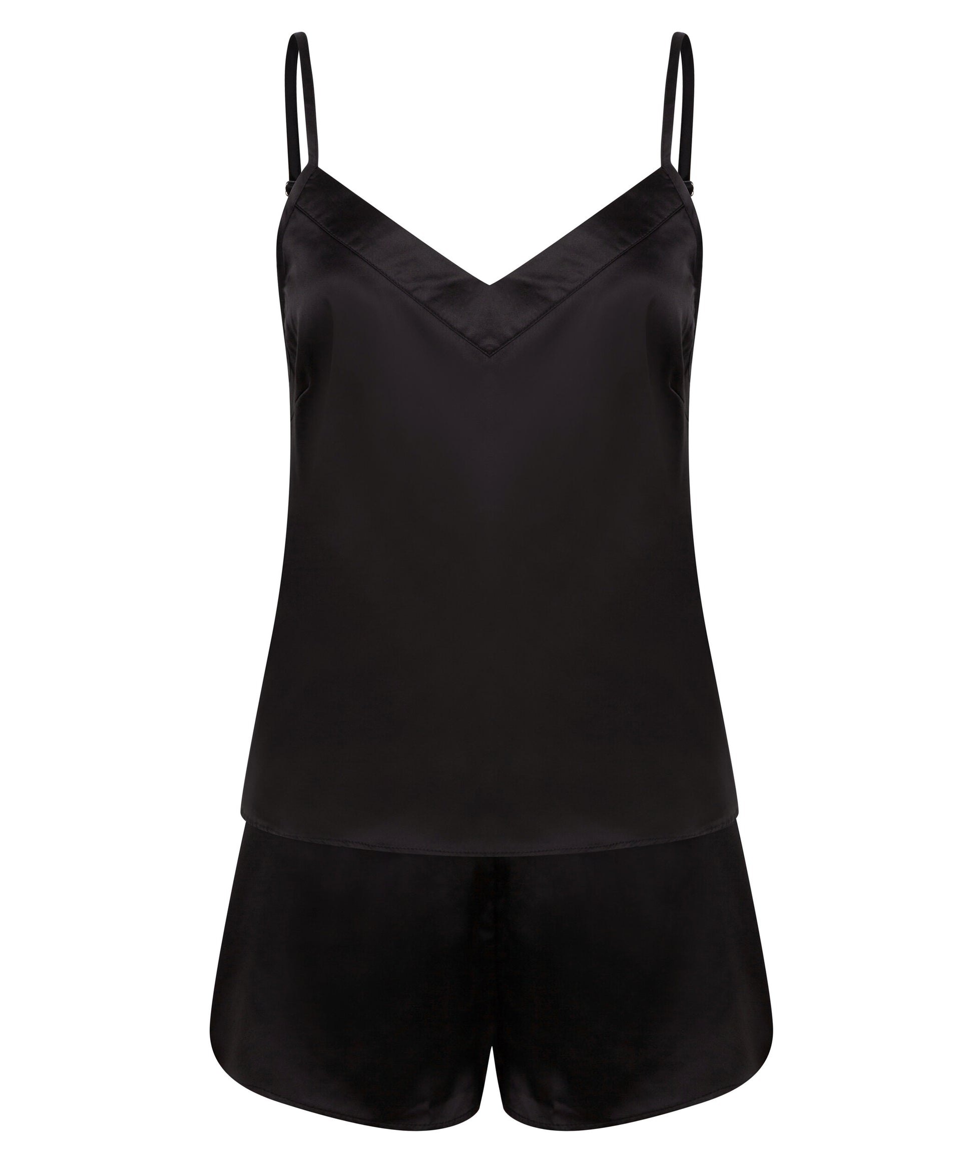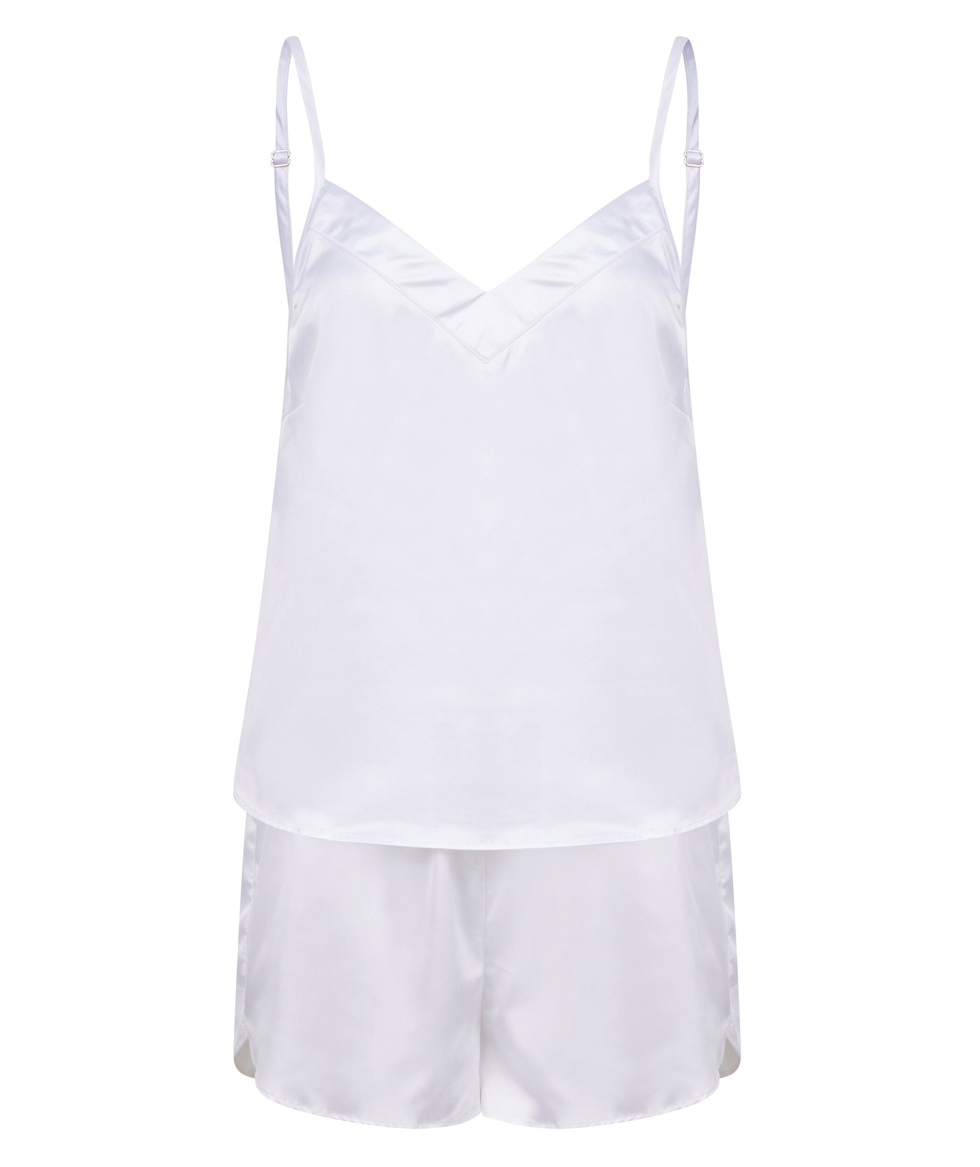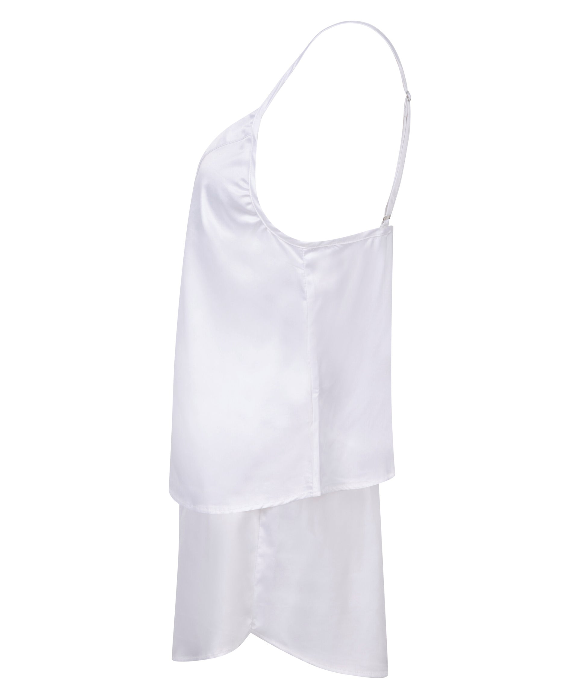 95% polyester / 5% elasthansatijn. Ruim topje met V-vormig decollete en fijne, regelbare schouderbandjes. Short met elastische tailleband. Gekleurd wasgoed bestand tegen 40 C Normaal programma|Chemische reiniging verboden. TC057